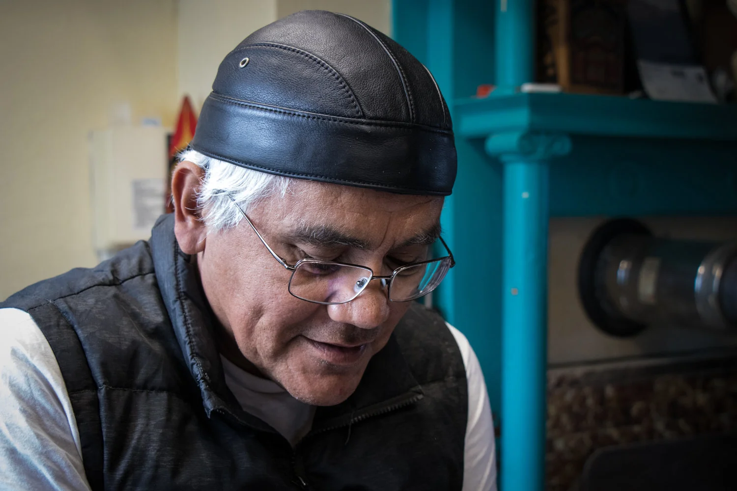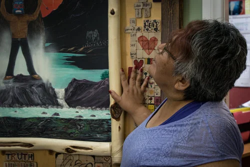 Healing is done through many ways. Here, Henry gazes up at a piece of art made by several members of different Indigenous communities.They find healing in creative collaboration, giving them a sense of community