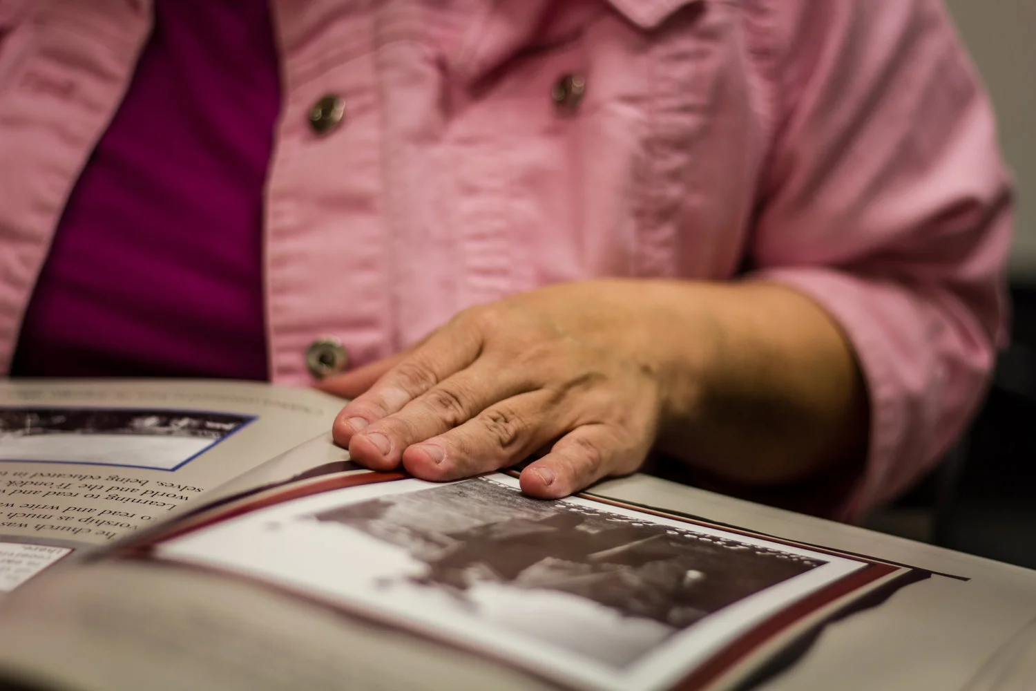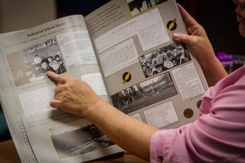 Isaac looks at a book on Residential Schools, using visual aids to show what life was like for these children